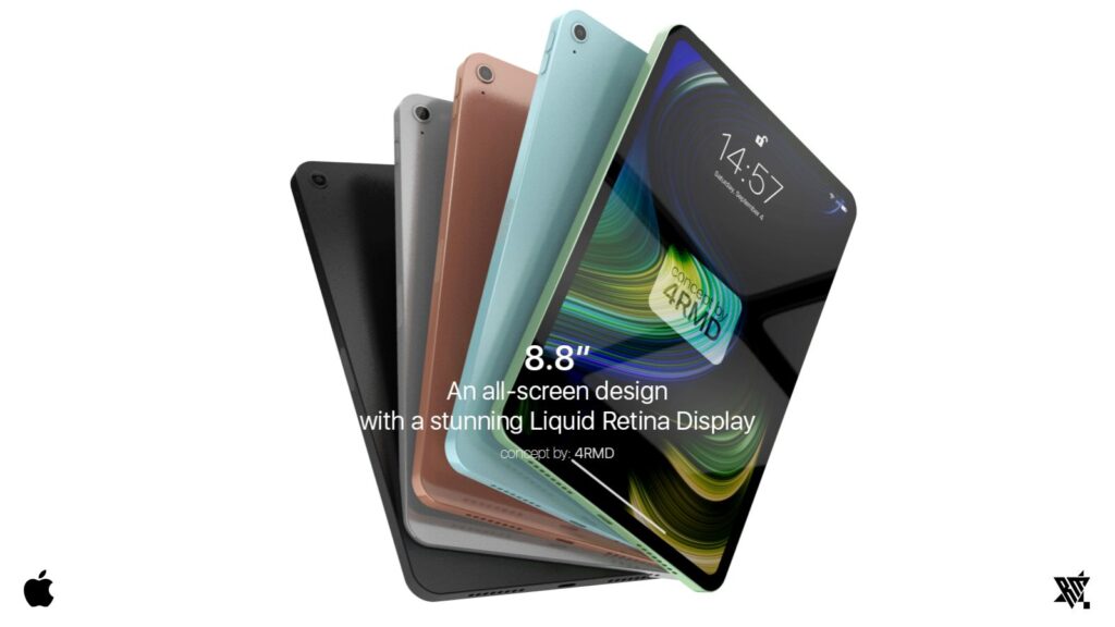 The device has been rendered by designer 4RMD and we have here a bigger screen, jumping from 7.9 inches on the first 5 iPad Minis to an 8.8 inch Liquid Retina panel. It offers a 90 Hz refresh rate, even though 120 Hz was expected rather. The slate has support for Apple Pencil, an USB-C connector and also a Smart Connector, as well as Touch ID in an upper Power button inspired by the iPad Air 4.