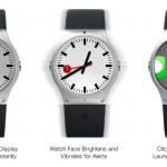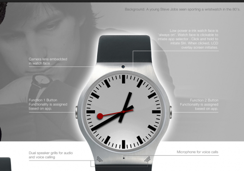 As you can see, the device is inspired by a watch that young Steve Jobs wore in the 80s. The iWatch comes with a camera lens embedded into the watch face and a low power E Ink watch face that’s always on, sort of like a display. It’s a clickable area that will initiative an app selector. If you click and hold Siri will start, so it’s a really smart setup.