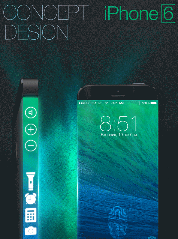 This iPhone 6 concept involves a wraparound screen with controls placed on the side, touch ones, for volume, connectivity and basically the whole Control Center. The first problem that comes to mind on such a device is the fragility of the glass sides, that will be easy to scratch or break. The appeal here would be the design itself, looking beautiful in the dark and glowing with notifications discretely.
