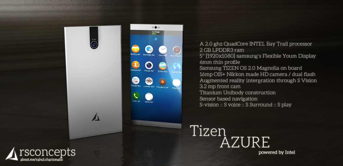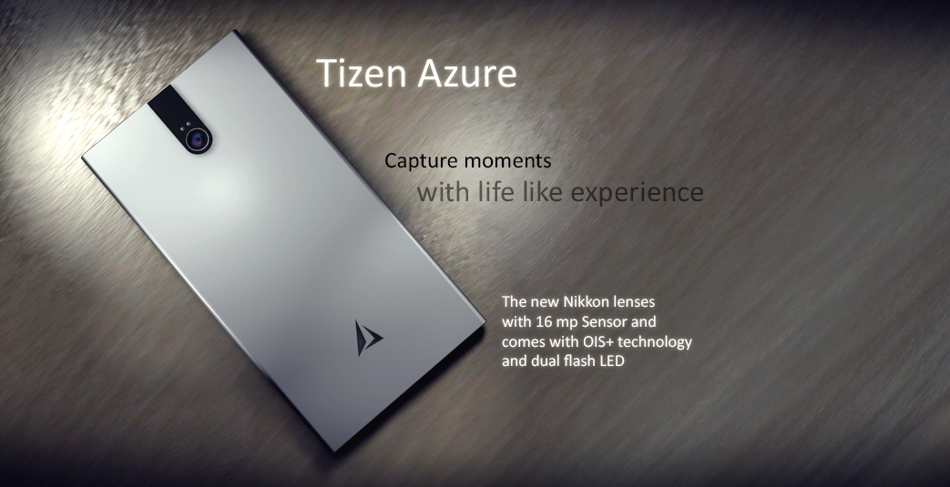 Sensors will replace volume keys and camera keys, integrated into the display sides. Tizen Azure features a 2 GHz Intel quad core Bay Trail processor, 2 GB of DDR3 RAM, Tizen OS Magnolia 2.0 on board and up to 128 GB of storage. There’s a 16 megapixel camera at the back with Nikon lenses and OIS, plus sensor based navigation and augmented reality.