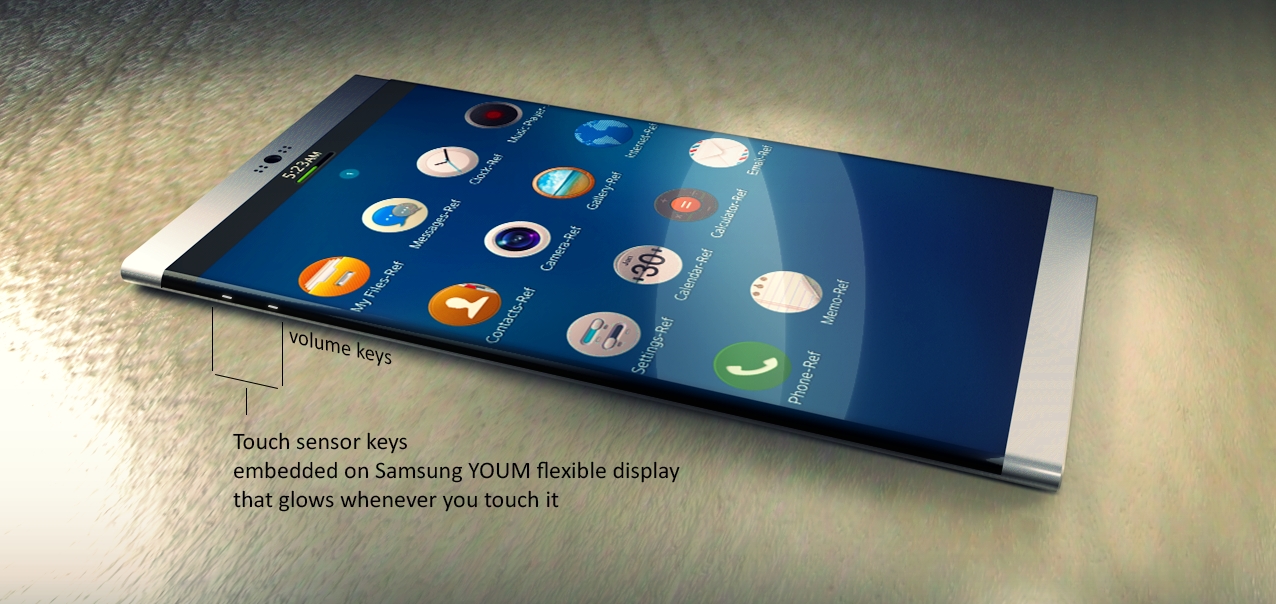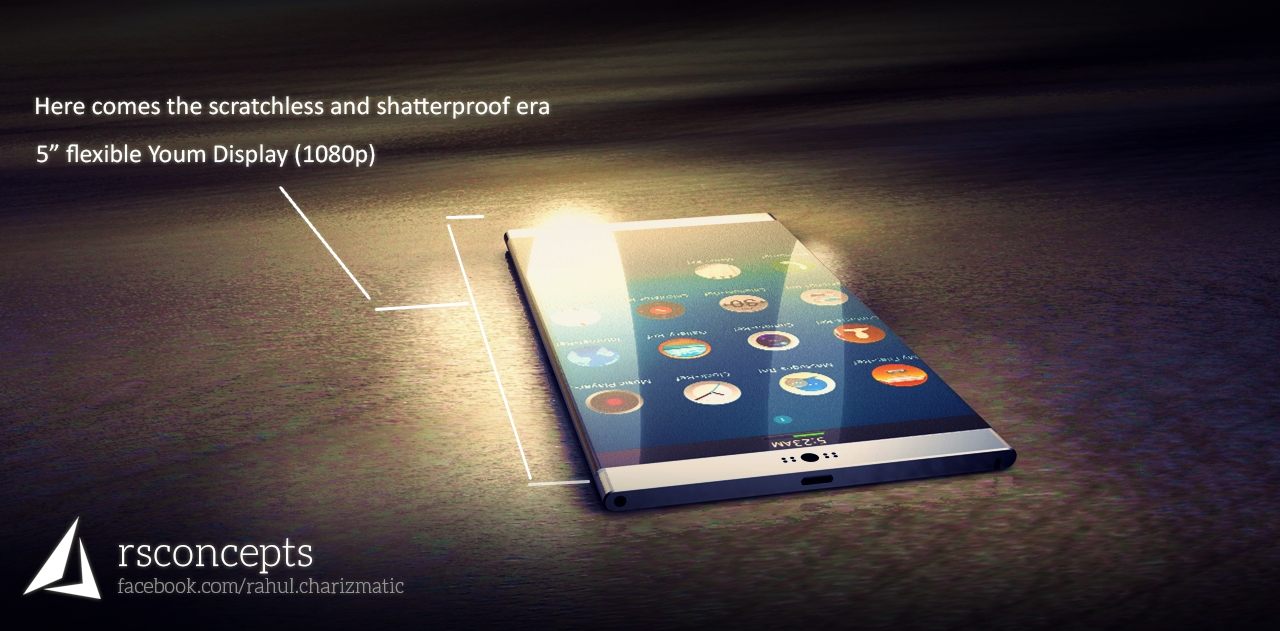 It has rounded curves at the sides and a profile that’s just 6 mm thin. We’ve also got the famous flexible YOUM display integrated, the one that Samsung has been working on for so long. The screen is integrated here with a 5 inch diagonal and a Full HD resolution. This turns the handset into a shatter proof unit and the screen stretches to the outer edges, as shown in the pics below.