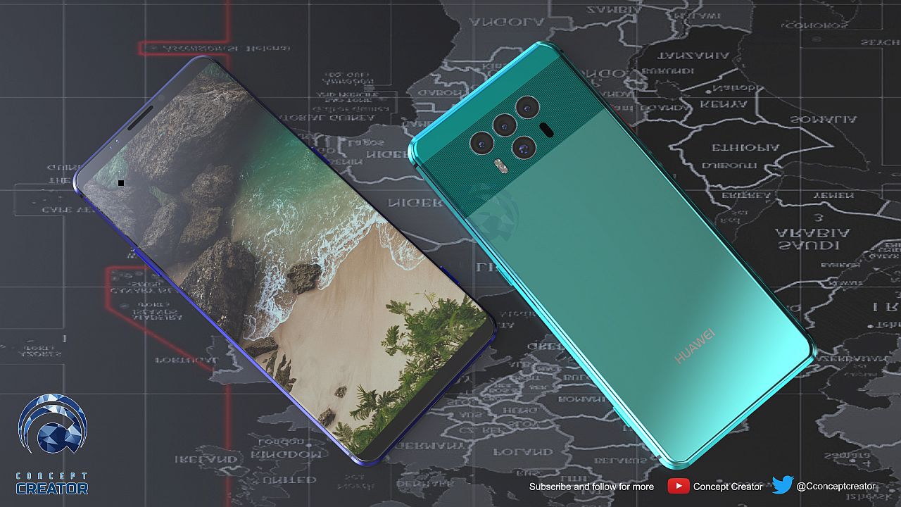 If I were to guess, I’d say we get a telephoto camera, a wide angle camera, a normal RGB camera and a monochrome one. I’m sure there will be a notch on the device, although some of the renders from Concept Creator don’t make that aspect very clear. The body is clearly more glass and less metal, but the frame remains metallic of course. The stripes of the Mate 10 Pro were kept and the general look of the camera area too.