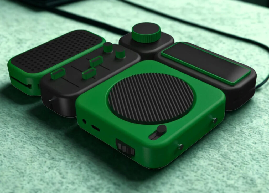 Even the ports are thoughtfully placed, as seen in the bottom edge of the green speaker module: USB-C charging, control toggles, and perhaps even audio I/O for modular daisy-chaining.