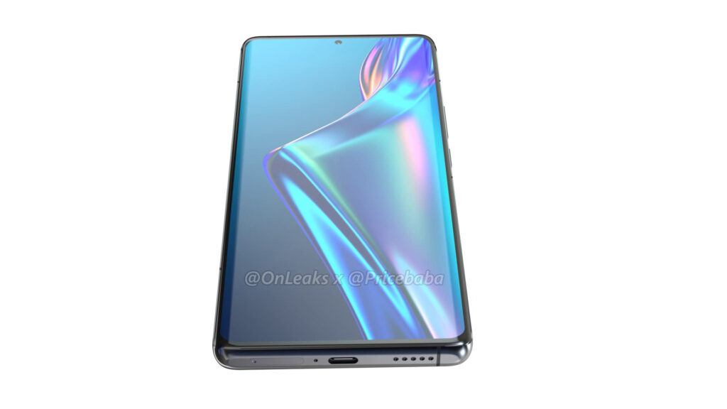Specs include a 6.7 inch screen, an AMOLED panel with 120 Hz Adaptive refresh rate. At the back we find a quad camera, with a periscope sensor in sight. There’s also a pill shaped flash and the Zeiss logo, confirming the partnership between companies again. The volume buttons and Power buttons are on the right and on the bottom you can see the USB-C port, with the SIM slot and a speaker.