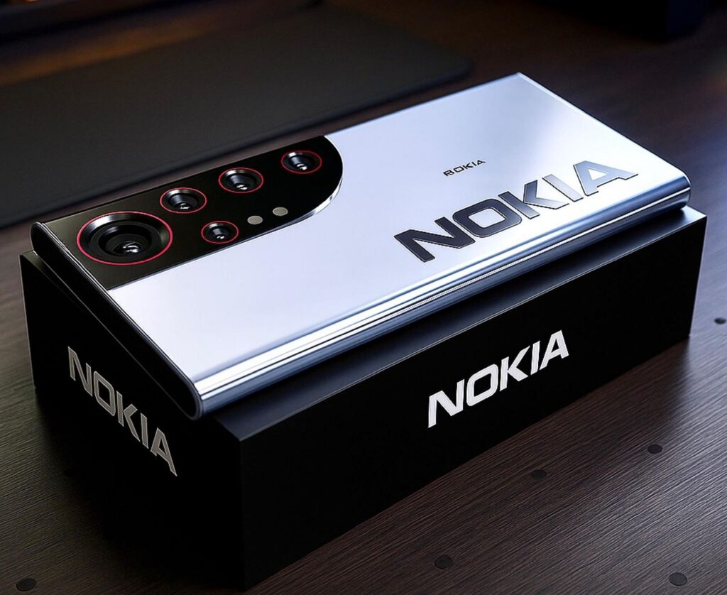 The design language here is striking: a mirror-like titanium finish, aggressively polished edges, and an oversized NOKIA logo dominating the back panel. The camera module takes cues from premium photography-first devices, with four large lenses accented by red rings, plus two auxiliary sensors or laser autofocus points. This is a look that demands attention, far from the understated approach of Nokia’s current HMD Global-produced smartphones in 2024 and 2025.