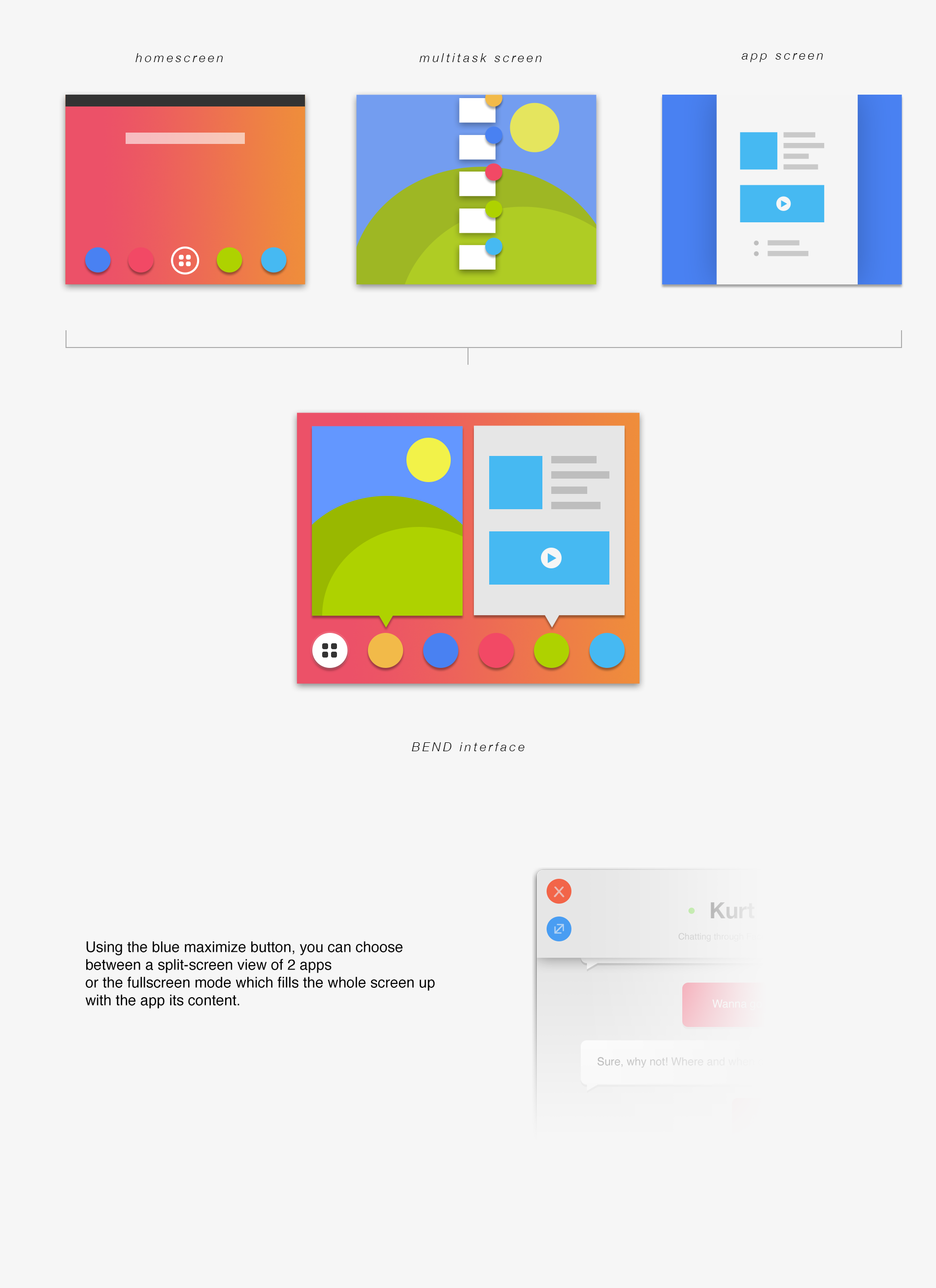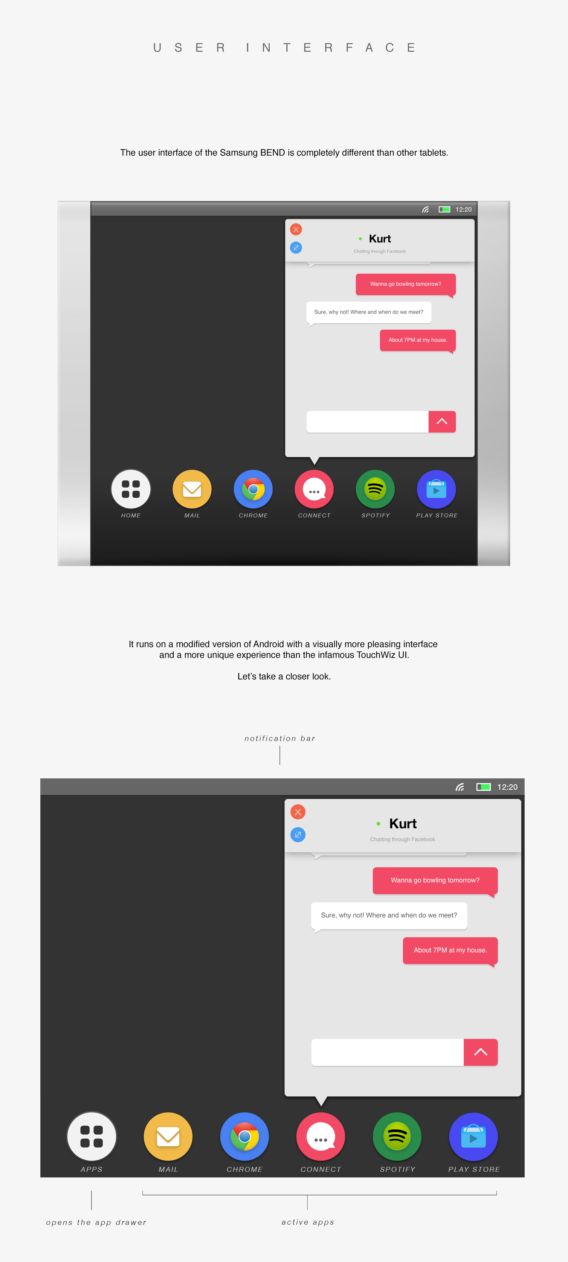 When you’re done typing, you can flex he device back to a slate and enjoy on screen content, with an edge to edge aspect. Finally, the designer claims you can unfold the lower part of the flexible screen and use it as a transparent keyboard of sorts. The UI is also different from what we know, bringing an Apple vibe to Samsung’s software…