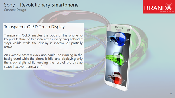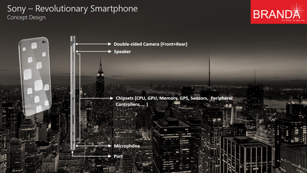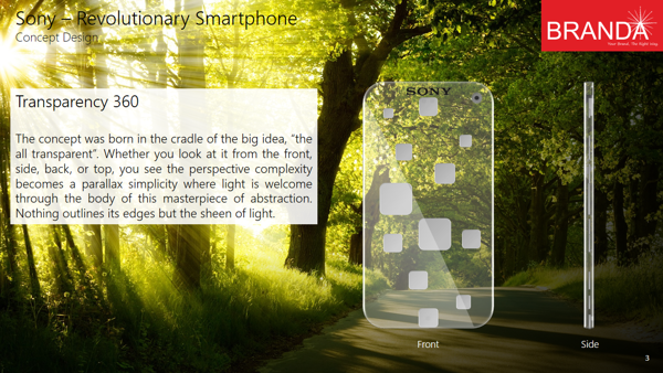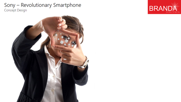 This Sony phone has a transparent body and the chipsets are enclosed into aluminum rounded squares, that are hiding the silicon inside. When you look at the concept phone from the side, back, front or top you will see the light going through the transparent surface. There’s a double sided camera here, with both a sensor at the front and one of the rear integrated together.
